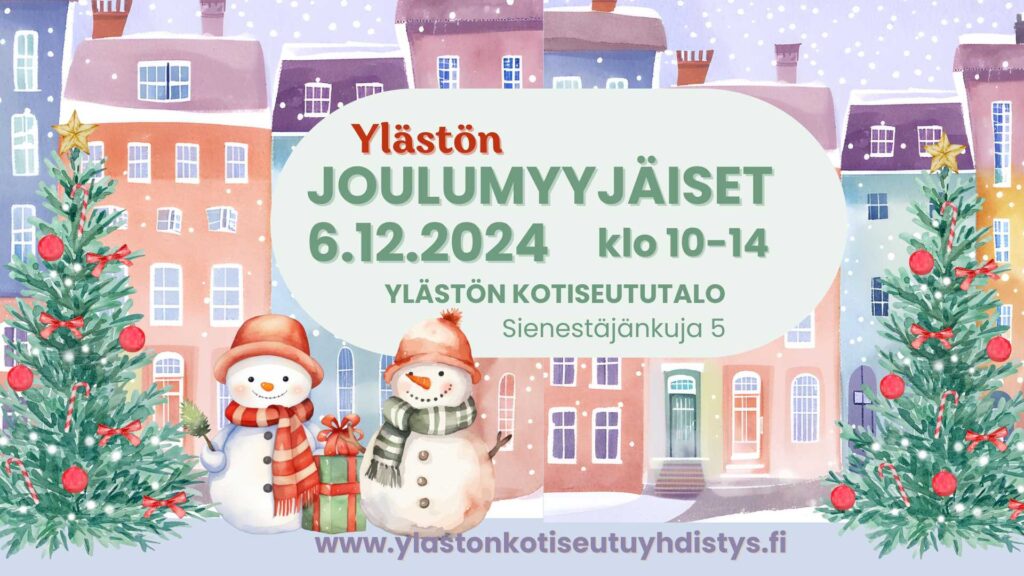 Ylästön Joulumyyjäiset 6.12.2024 järjestetään Ylästön Kotiseututalolla, Sienestäjänkuja 5.Myyjäiset on avoinna yleisölle klo 10–14.